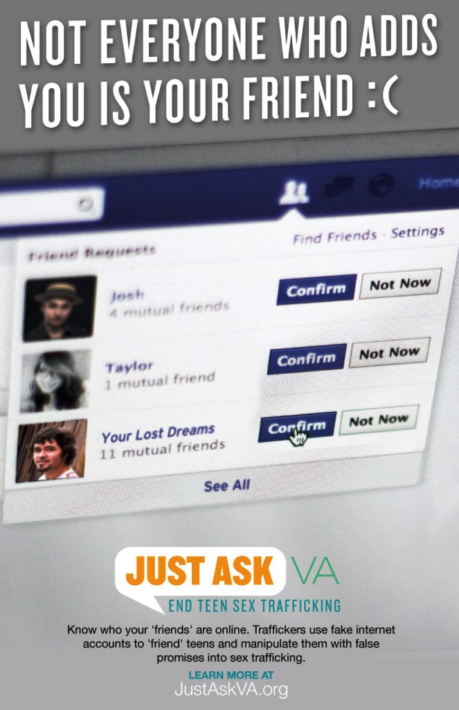 Many people believe teen sex trafficking only happens to runaways or in other more urban settings. But, it is on the rise across Northern Virginia and teens are now being targeted in public venues; bus stops, walking down the street, parties, shopping malls, through social media outlets, and more. Sex traffickers do not discriminate; they recruit victims across ethnic, economic and gender strata. Most teens are unaware they are being drawn in and often don’t recognize the signs of manipulation until it is too late. Traffickers are not just gang members or “criminals”; they may be business professionals, family members, students and teens they know. The trafficker may not be a stranger; rather it may be a friend or acquaintance from the classroom.