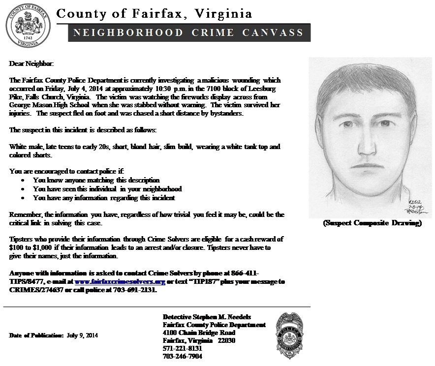 New flyer referencing July 4 Falls Church area stabbing now posted Posted on July 9, 2014 by FCPD Public Affairs Bureau Detectives will be circulating this flyer in local communities. Please let police know if you have any information on this crime. Share this information: Share on X (Opens in new window) X Share on Facebook (Opens in new window) Facebook Share on Reddit (Opens in new window) Reddit Email a link to a friend (Opens in new window) Email Print (Opens in new window) Print Like Loading... tagged with LHC Crime Crime Solvers Mason Police District