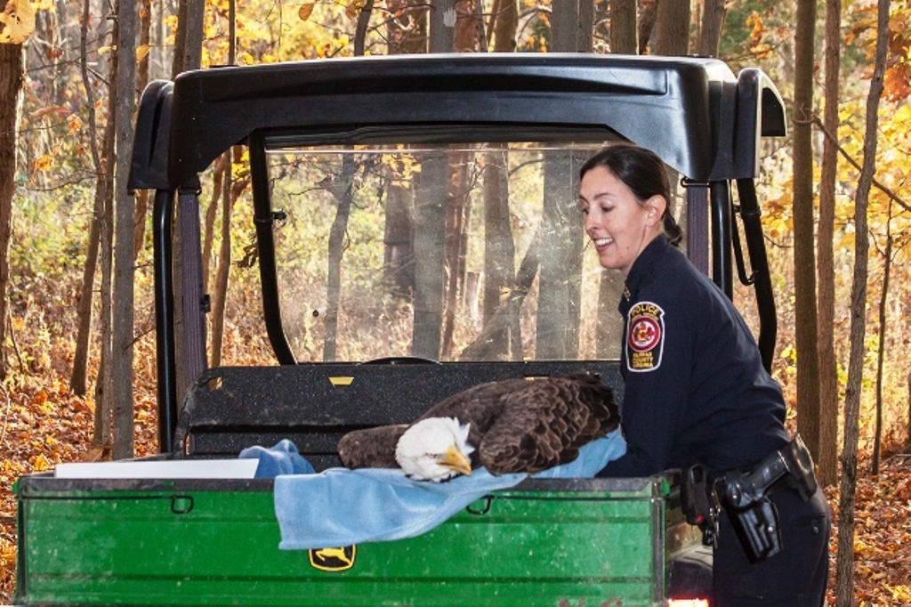 The eagle reportedly hopped around among the brush piles, trees and tried to swim off, as she pursued it. When a helpful park visitor blocked exit routes for the eagle, the officer was able to make the capture.