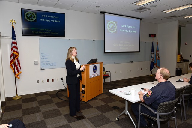 Karen Ambrozy, Forensic Biology Section Supervisor for the Northern Virginia Laboratory, shared her expertise, advice, and reflections with the group. Discussions surrounding fingernail clippings, hair, blood, and bodily fluids, most appropriate analysis tests, submission policies, documentation issues, along with a DNA-refresher, engaged the group.