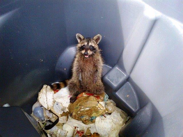 This raccoon was trapped in this dumpster; animal control officers responded and set it free. It did not exhibit any signs/symptoms of the rabies virus.