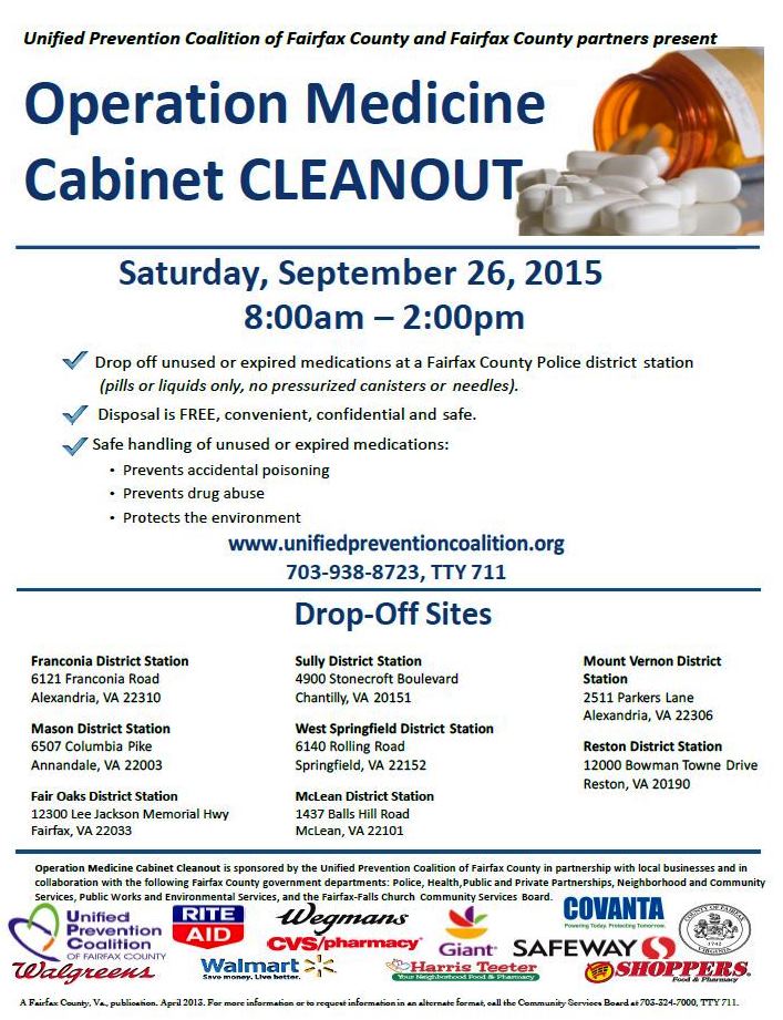 Dispose of old, unused, or expired medications at any Fairfax County Police station on Saturday, September 26, 2015 between 8 a.m. and 2 p.m. Help keep your community safe and drug-free.