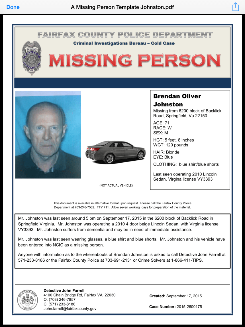 Johnston was last seen this evening driving a 2010 4-door Lincoln sedan with Virginia tags: VY-3393 in the 6200 block of Backlick Road in Springfield. He was wearing a blue shirt and blue shorts. He suffers from a memory impairment and may be in need of assistance.