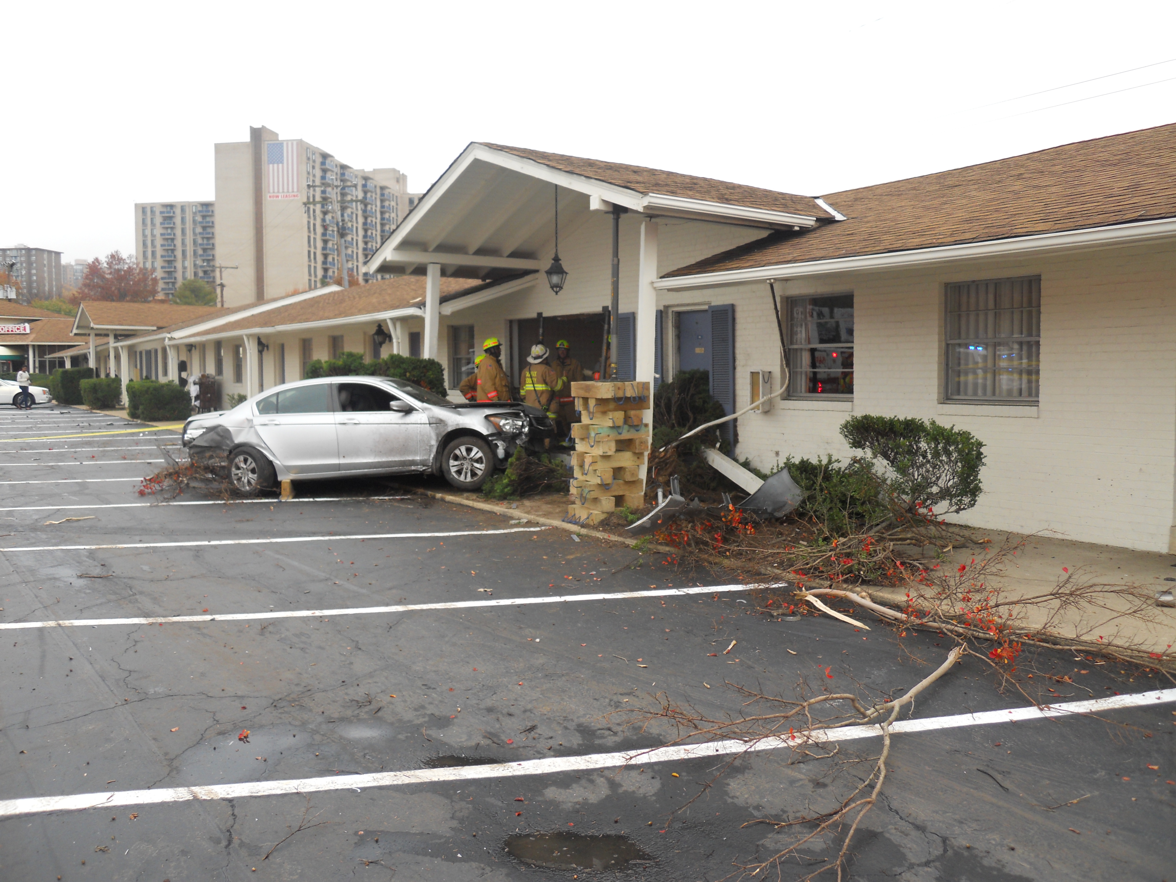 Shortly before 11 a.m., one of two vehicles, allegedly involved in a road rage incident, ended up striking the Travelers Motel at 5916 Richmond Hwy. Minor injuries reported. Elmer King, 50, of Alexandria, was charged with aggressive driving.