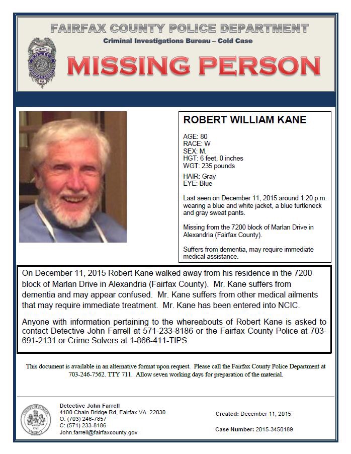 Please Help us Find this Critical Missing Man. Posted on December 11, 2015 by FCPD Public Affairs Bureau Robert Kane, 80 years old, was last seen around 1:30 p.m. On Friday, December 11, in the 7200 block of Marlan Drive, in the Alexandria area of Fairfax County. Share this information: Share on X (Opens in new window) X Share on Facebook (Opens in new window) Facebook Share on Reddit (Opens in new window) Reddit Email a link to a friend (Opens in new window) Email Print (Opens in new window) Print Like Loading... tagged with DRG Missing Person