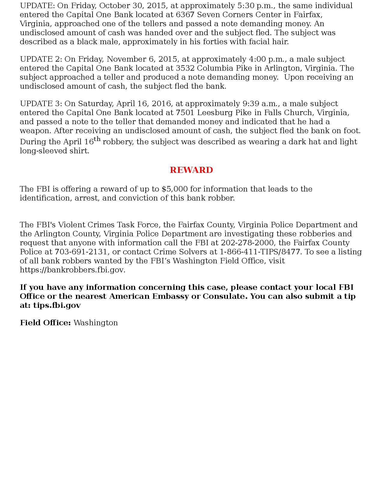 FBI Bank Robbery Wanted Poster April 16 2016 Capital One Bank Falls Church VA-page-002 Posted on April 19, 2016 by FCPD Public Affairs Bureau Previous Next Return to Help Identify a Serial Bank Robber