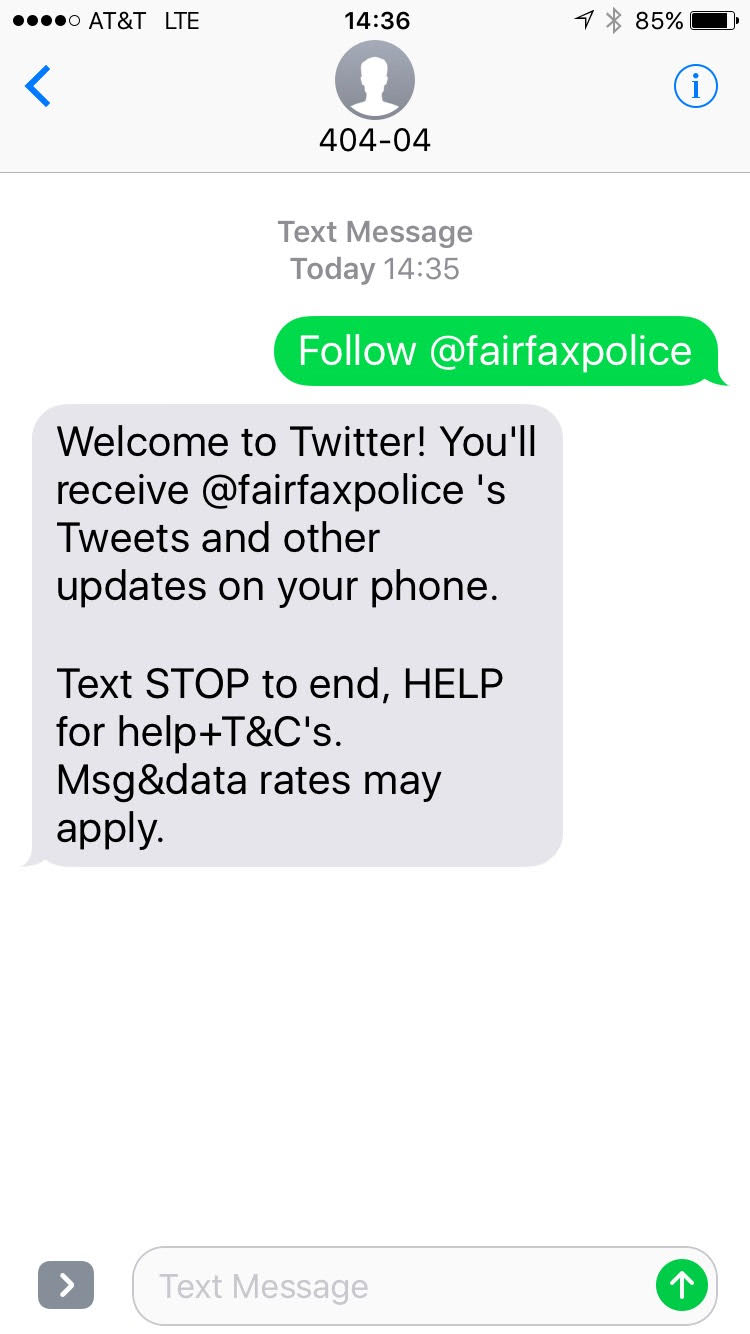 121516texttwitter1 Posted on December 15, 2016 by FCPD Public Affairs Bureau Next Return to Twitter – Schmitter. Don’t have a Twitter account but want to receive our tweets? Easy peasy!