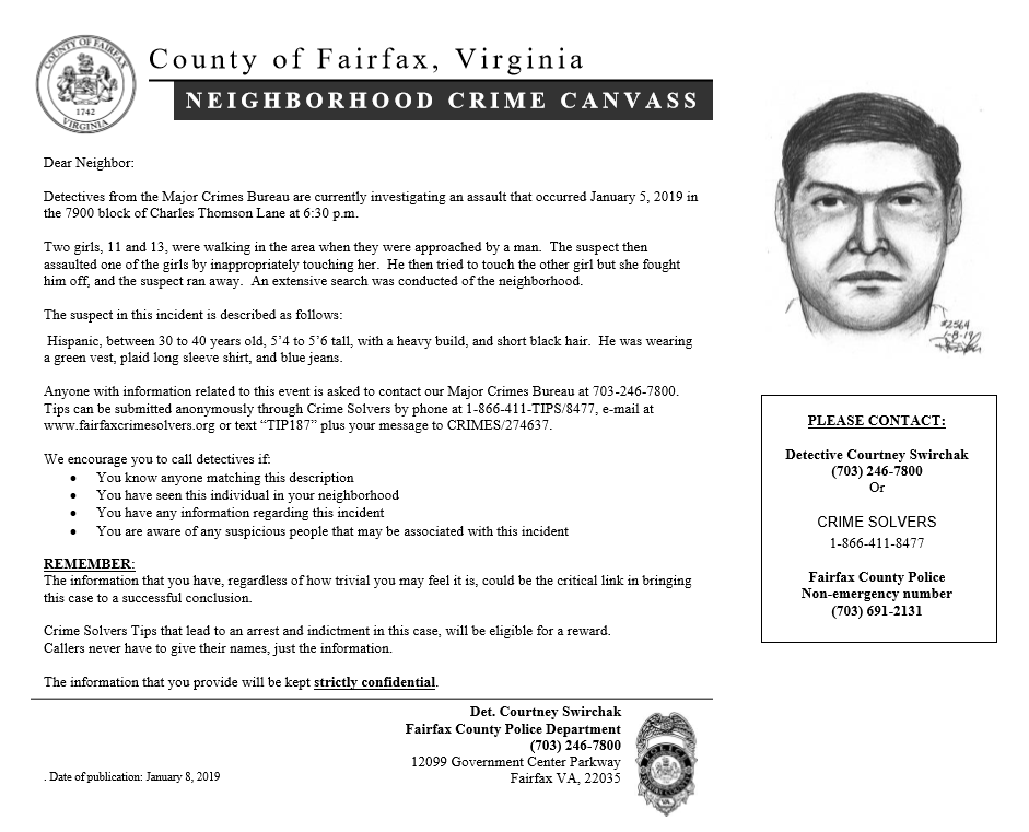 01082019 annandale assault flyer english Posted on January 8, 2019 by FCPD Public Affairs Bureau Previous Next Return to UPDATE: Detectives Release Composite Sketch of Man who Assaulted Two Girls in Annandale