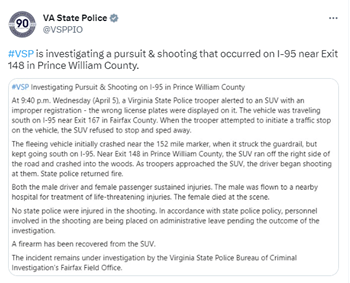 Fairfax County Police Department – Virginia State Police (VSP) continue to investigate the April 5 officer-involved shooting of an abduction suspect that occurred in Prince William County.