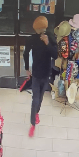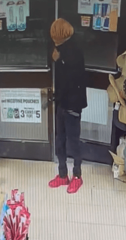 The suspect is described as a slim black male, in his early twenties, wearing dark clothing with red shoes. The suspect also had a brown bonnet covering his head during the robbery. Photos of the suspect are below.