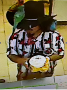 Yesterday, around 8 a.m., officers responded to the McDonald’s at 6165 Arlington Boulevard in the Seven Corners area for a strong-armed robbery. The victim, an adult man, reported one unknown man displayed a knife and robbed him of an undisclosed amount of money. The suspect was described as a Hispanic man between 28-32 years old with tattoos. Detectives discovered surveillance footage from a nearby business of the suspect. The suspect can be seen below wearing a black cowboy hat with two parrots, a patterned shirt, and a third parrot on his shoulder. The suspect left the area in a blue Ford SUV.