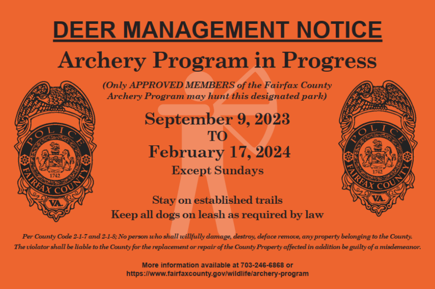 The Fairfax County Deer Management Archery Program begins Saturday, Sept. 9, 2023, and runs through Saturday, Feb. 17, 2024.