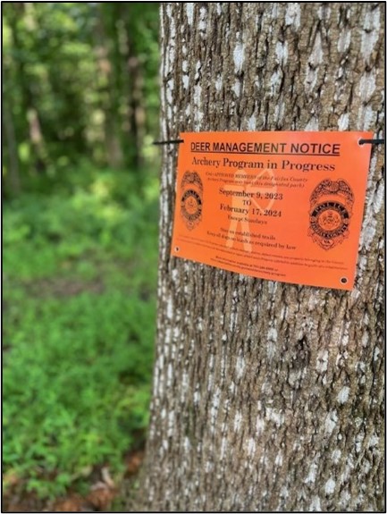 Parks remain open to the public during the archery program. Florescent orange signs are posted in parks where hunting is authorized. Hunters can only take shots at deer from elevated tree stands; hunting from the ground level is prohibited in county parks. Tree stands must not be located closer than 100 feet from property lines or closer than 50 feet from established park trails. Archers are not allowed on private property without permission by the owner or tenant. Archers are approved to hunt at assigned sites Monday through Saturday during legal hunting hours, 30 minutes prior to sunrise until 30 minutes after sunset. No hunting is allowed on Sundays in county parks. More information about the Fairfax County Deer Management Program can be found at: https://www.fairfaxcounty.gov/wildlife/deer-management-program