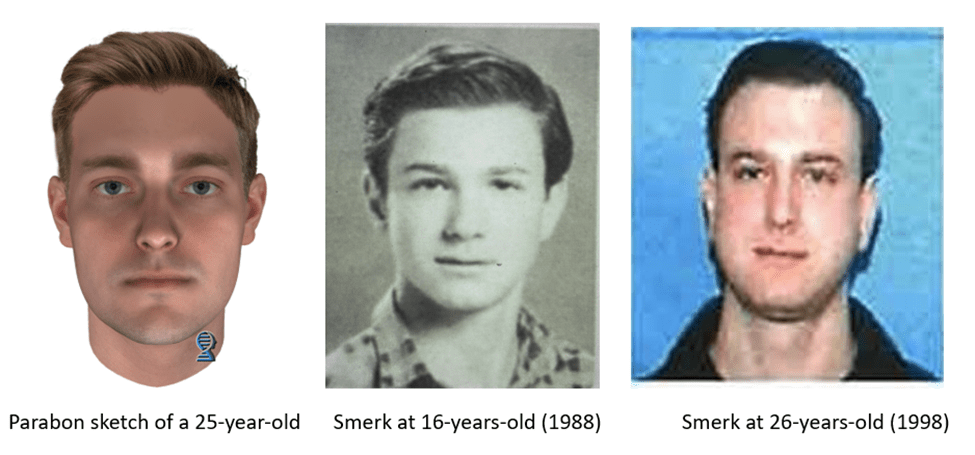 Pictures of Smerk from 1988 and 1998 were found and compared to a digital composite image created by Parabon NanoLabs. Parabon NanoLabs is a DNA technology company in Northern Virginia that specializes in DNA phenotyping and genetic genealogy analysis: processes that predict physical appearance and biological relationships from unidentified DNA evidence.