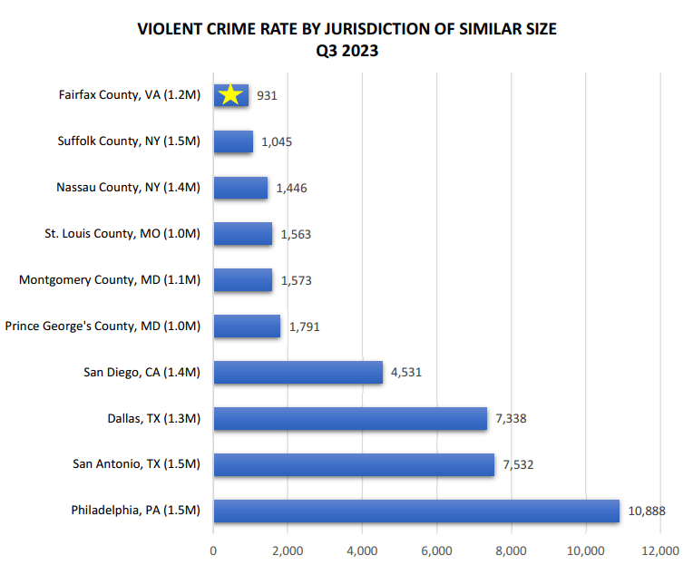 Fairfax, VA – With the recent release of the Third Quarter Crime Report by the Major Cities Chiefs Association (MCCA), spotlighting the nation’s 70 largest police departments across key crime categories, including Homicide, Rape, Robbery, and Aggravated Assault, we proudly affirm that Fairfax County retains its distinction as the safest jurisdiction of its size. In the MCCA’s evaluation of violent crime ratings among all participating agencies, Fairfax County stands as an example of safety and security for its residents.