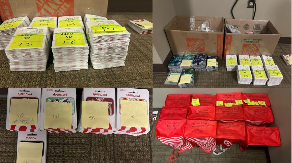 A search of the suspect’s vehicle uncovered numerous altered Target gift cards and evidence of a larger fraud ring in the region and extending into states across the country. In total, officers recovered just under 1,000 altered gift cards.