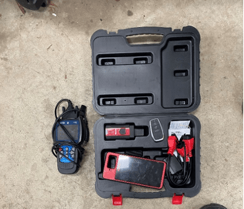 A search of both vehicles revealed a key programming tool, two reprogrammed key fobs for the stolen Charger, auto parts from the stolen Charger, and additional vehicle parts in the trunk.