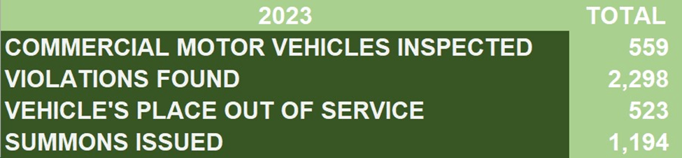 The unit consists of one supervisor, four full-time officers, and six supplemental officers. These officers undergo extensive training to be certified as a Motor Carrier Safety officer.