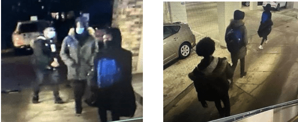 - The third suspect was described as a juvenile black male wearing a grey fur hoodie, black pants, wearing a blue surgical mask and ski mask, and armed with a handgun.