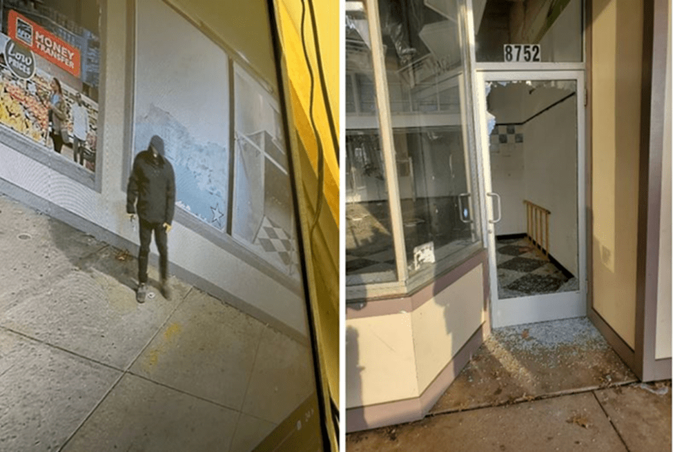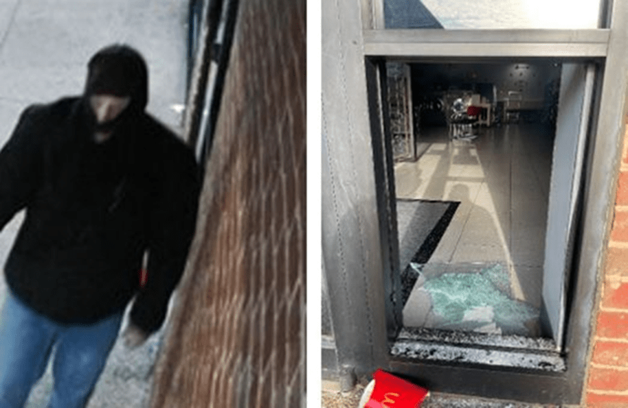On December 30 at 12:30 a.m., officers responded to the report of a burglary at 8752 Richmond Highway in the Woodlawn Shopping Center. The location is currently in the process of being converted into a dry-cleaning business. A suspect broke a window to the business and entered. Nothing appeared to be taken. The suspect was wearing bright yellow gloves, a black hooded zip-up jacket, black pants, black mask, brown and gray shoes. Detectives located surveillance footage of the man which can be seen below: