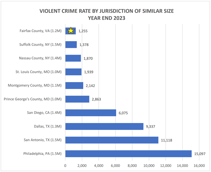 Fairfax County, VA – As major cities across the nation continue to gather and analyze their 2023 crime statistics, the Fairfax County Police Department (FCPD) has once again secured Fairfax County’s distinction as the safest jurisdiction of its size. With the evaluation of violent crime ratings among all participating agencies cited in the Major Cities Chiefs Association (MCCA)’s Year-End Crime Report, Fairfax County stands in its commitment to safeguard its communities, serving as a model of safety and security.