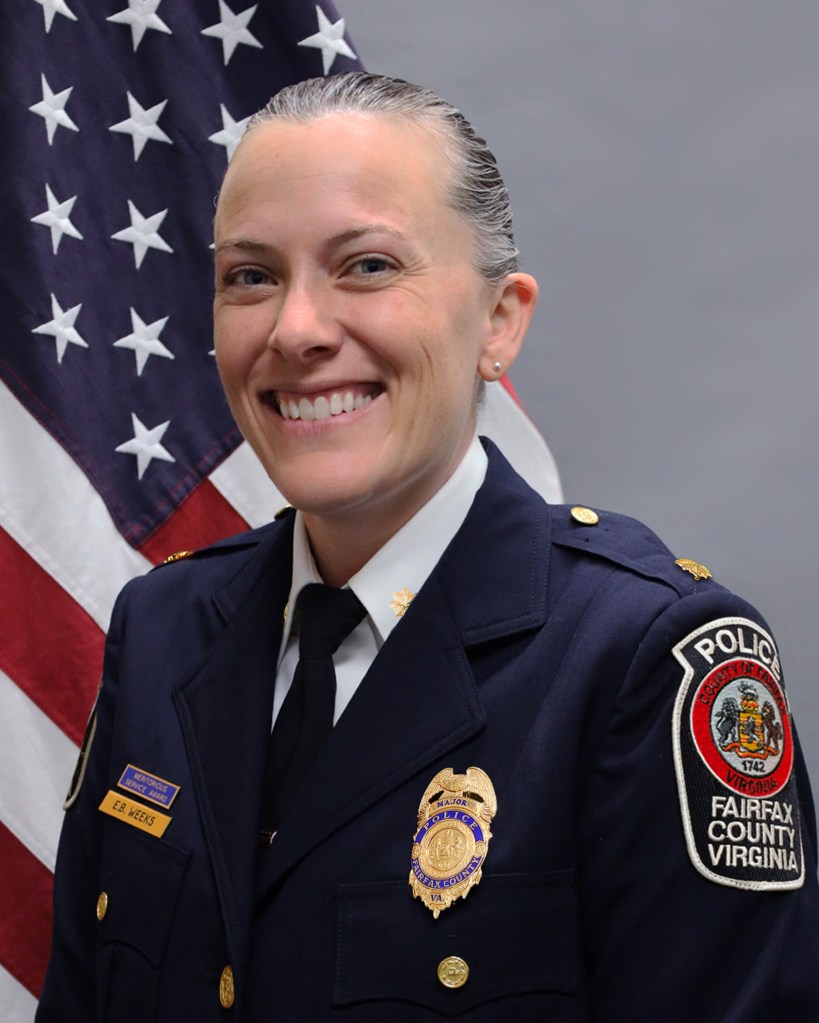 Major Weeks earned her bachelor’s degree from Radford University and completed professional training programs such as International Association of Chief’s of Police’s (IACP) Leadership in Police Organization training, IACP Women’s Leadership Institute, FCPD’s Commander College and the DC Police Leadership Academy.