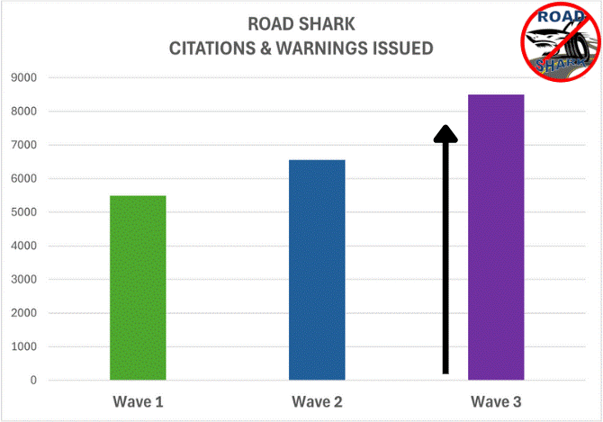FCPD officers and our Virginia State Police partners worked tirelessly throughout the week to educate and issue over 8,500 citations and warnings. That’s over 2,600 more citations and warnings issued in our third Road Shark wave of 2023.