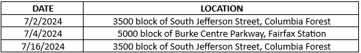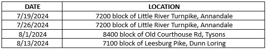 Below is a chart detailing the dates and locations of the thefts in Fairfax County by this individual: