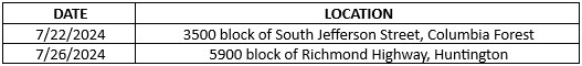 On August 2, detectives arrested Lonnell Jennings, 26, of Washington, D.C. Jennings was charged with Grand Larceny, Possession of Stolen Property with Intent to Sell, Conspiracy to Commit Larceny, and Petit Larceny. Jennings was transported to the Fairfax County Adult Detention Center and held on a $2,500 bond.