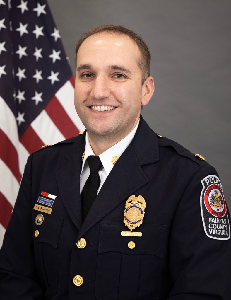 Major Bowman holds a bachelor’s degree from the Virginia Military Institute. He is a graduate of the Leadership Fairfax Emerging Leader’s Institute, FCPD Commander’s College, and holds a certification from the Force Science Institute.