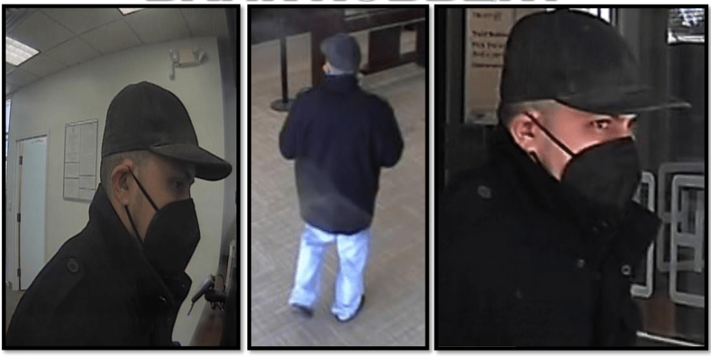 The suspect is described as a white man, approximately 5’5”, average build, with dark hair. He was wearing a black surgical mask, a black coat, blue jeans, and black Croc shoes.