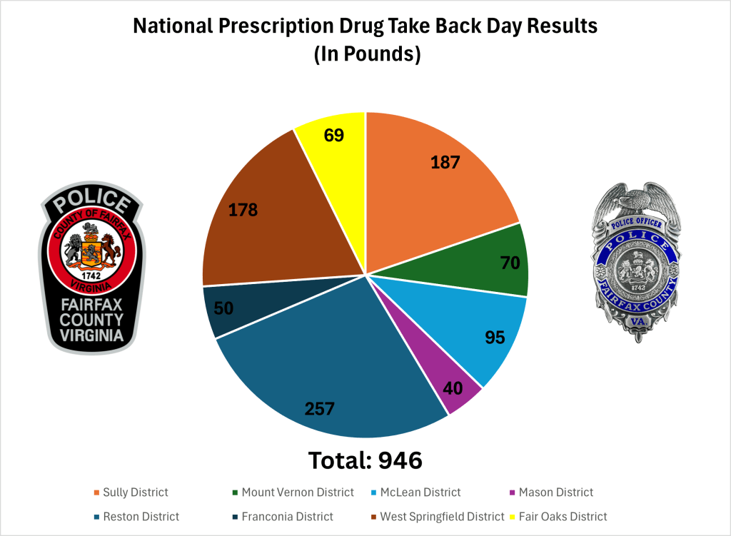 Fairfax County, VA – On Saturday, our district stations partnered with the Drug Enforcement Administration (DEA) and other Fairfax County agencies to collect nearly 1,000 pounds of expired medications and prescription drugs from our community during the 28th Annual National Drug Take Back Day Initiative.