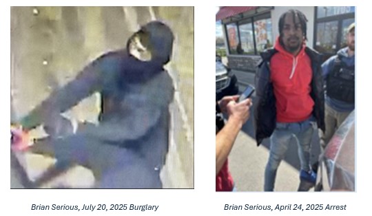One suspect, Brian Serious, 29, of Maryland, has been identified. He is believed to be responsible for this burglary, as well as previous break-ins at the same plumbing supply store and other locations across Fairfax County, noted in the chart below. Serious currently has 25 active felony warrants tied to these cases.