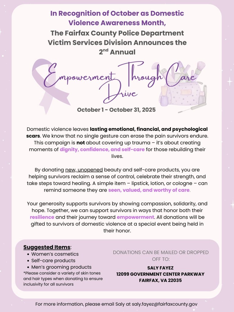 All donations will be gifted to domestic violence survivors at a special event held in their honor. For more information please email Saly at Saly.Fayez@fairfaxcounty.gov.