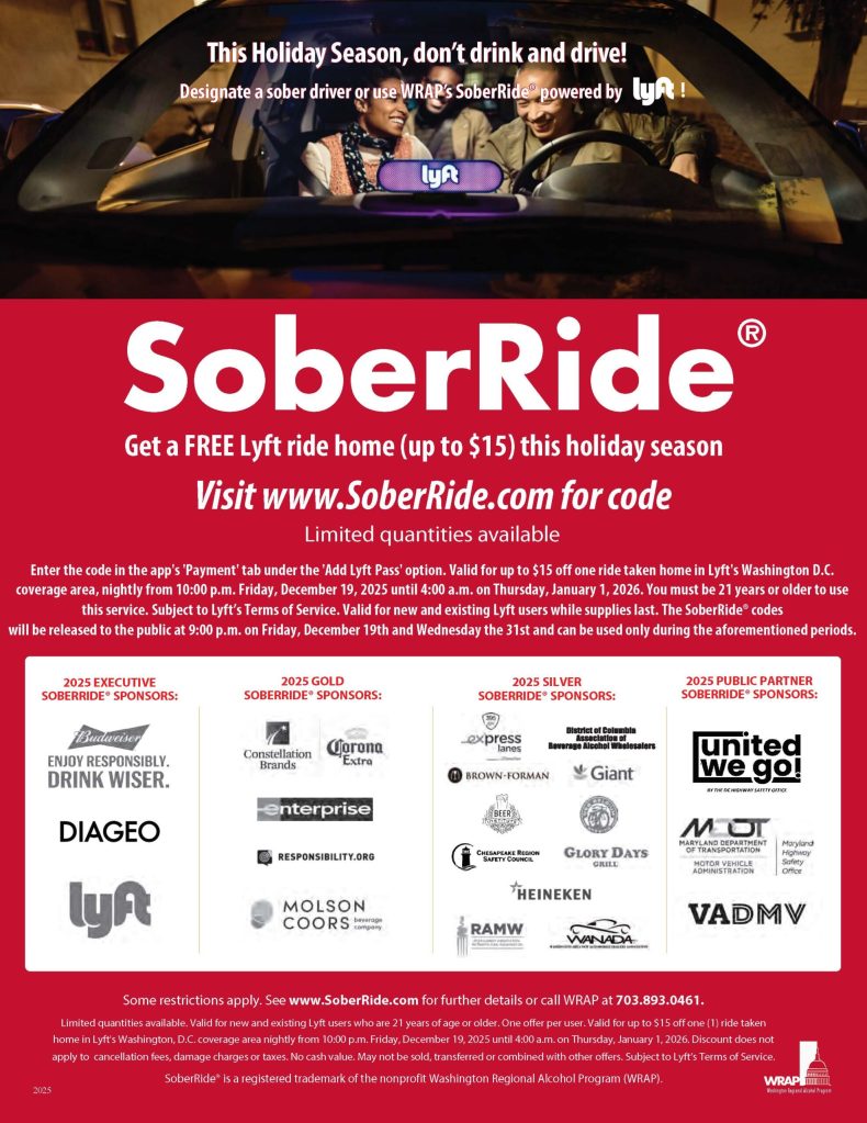 WRAP’s first 2025 Holiday SoberRide code, DCSAFERIDE25, is valid nightly from 10:00 p.m. to 4:00 a.m., now through 4:00 a.m. on December 31, for the first 2,000 passengers. A second New Year’s Eve-specific code will be released at 9:00 p.m. tonight.