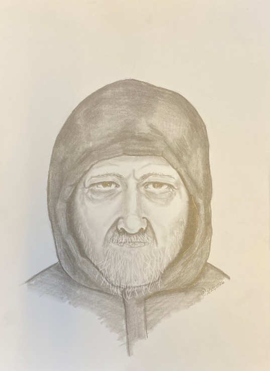 The suspect is described as an older white man with gray hair and a scraggly beard. The suspect was wearing a black puffer jacket with a black hood that was up at the time of the incident. A composite sketch of the suspect can be seen below.