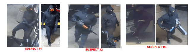 Officers reviewed surveillance footage and observed three masked men force entry into the closed business and gain access into an ATM with an orange and black colored hydraulic tool. The suspects stole ATM cassettes containing cash before fleeing in a black Dodge Durango.