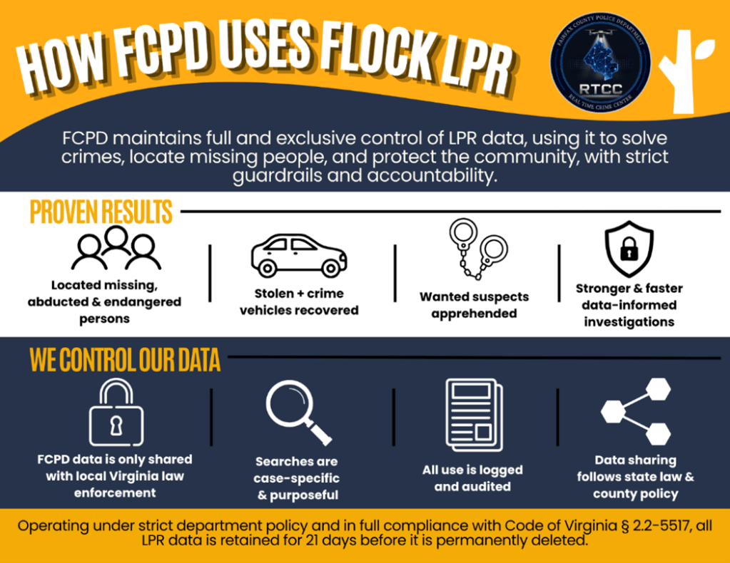 FCPD remains committed to the responsible and transparent use of LPR technology. These systems are used strictly for legitimate law enforcement purposes, including criminal investigations and missing person cases, and are supported by strong public-facing policies, regular audits, and oversight to ensure compliance with Virginia law. This balanced approach ensures that while FCPD leverages cutting-edge technology, it also maintains the trust and confidence of the community it serves.